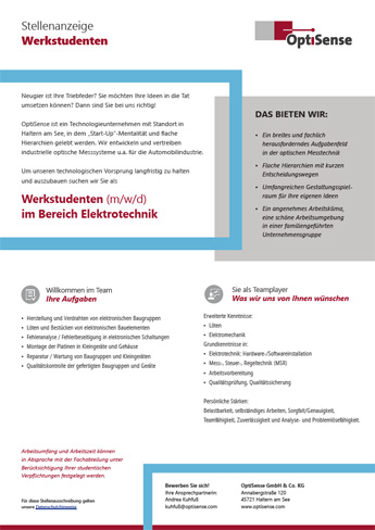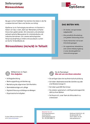 Wir geben unser Bestes, damit Sie Ihr Bestes geben können. Für sein Engagement als Arbeitgeber wurde OptiSense bereits mehrfach ausgezeichnet – unter anderem als „Arbeitgeber der Zukunft“ vom Deutschen Innovationsinstitut für Nachhaltigkeit und Digitalisierung (DIND) sowie mit dem „German Business Award 2023“ des internationalen Wirtschaftsmagazins EU Business News, u. a. für starke Innovationen, dauerhafte Spitzenleistungen sowie die hervorragende Marktposition in der Sensorbranche.